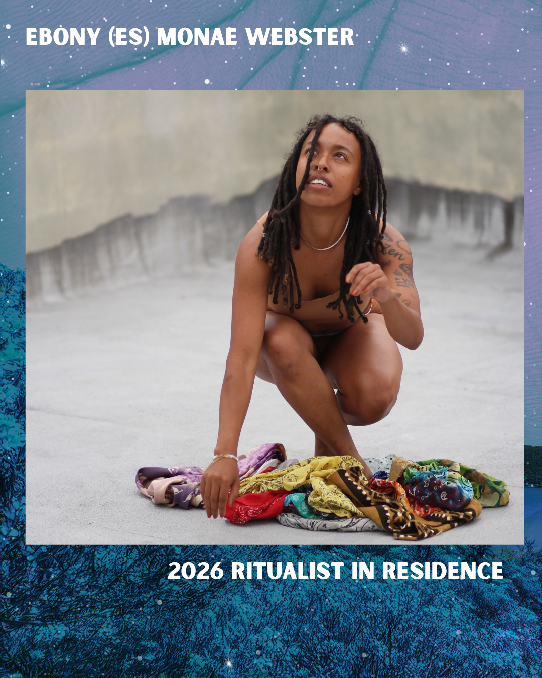Biography: Ebony Monae Webster has been going as Es these days. Es is an Afro Caribbean; all encompassing, all embracing, all inclusive, womb being, belonging to first herself as God and then God themselves. Ebony is an embodied performance artist called to guide the ascension of the collective consciousness into the new paradigm through: artistic expression that explores the body as a portal, black liberation, afro-futurism, multidimensional spirituality, memory as a healing technology; by being quiet and being loud. Read more about Es here.